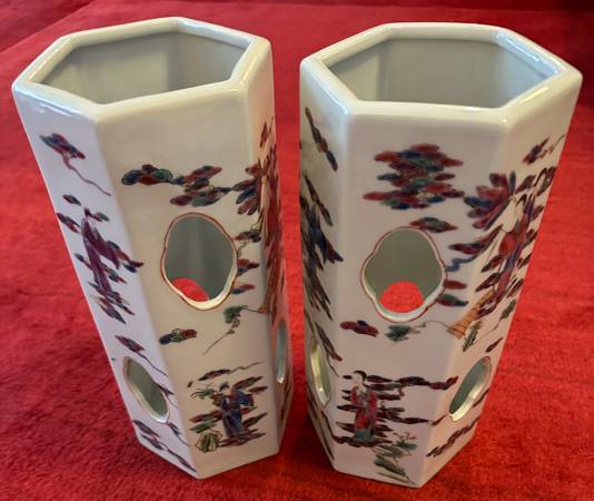 Antique pair of Chinese Famille Rose Porcelain Hat Vases. Each hat stand is: 11” high. 4.5” - 5” across top.