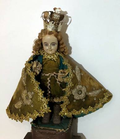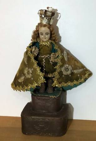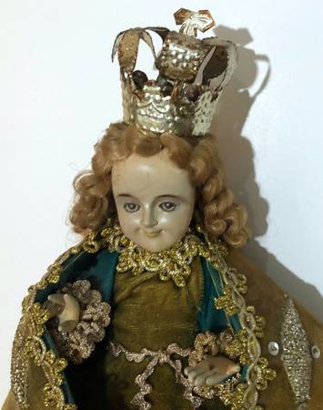 GORGEOUS ANTIQUE SANTOS STATUE ON INFANT JESUS OF PRAGUE - WITH ORIGINAL CLOTHING & GLASS EYES