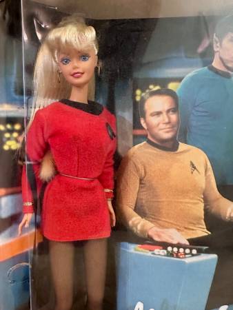This is a 1996 30th Anniversary of Startrek (Not Barbie and Ken!) Collector's edition. For fans of Barbie AND Startrek, although I can't imagine there was much overlap in those two fan bases. I'm not sure if the box has ever been opened. The seams of the box show some very old tape, which could be there just to hold the old box together. Both Barbie and Ken are still be tethered to the cardboard backing - it doesn't look like they were ever removed. The box comes with a miniature Tricorder, Phaser, and Communicator. It looks like the Phaser fell out of Ken's hand but is still inside the box.