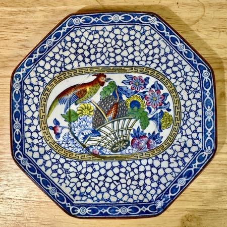 This is a Beautiful Antique Adams "Chinese Bird" Plate. Gorgeous colored bird and flower design. Rare octogonal shape. Very good condition, no noticeable chips or fractures. Color is slightly faded, hence the low price. Nice intricate blue and white pattern around the exterior. Just a really cool design! 7" Diameter. Research tells me the original series appeared in the 1780s, and these "copies" were manufactured in the 1920s. Very collectible.