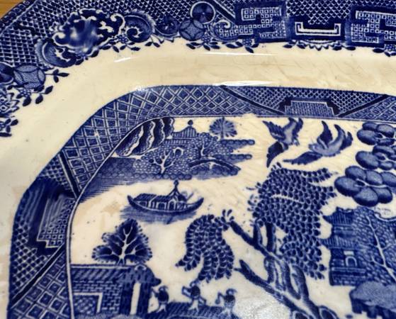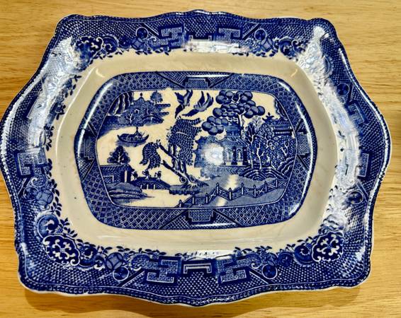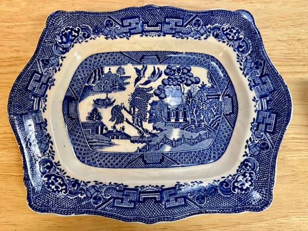 Beautiful Small Blue Willow Platter. Royal Venton Ware. Crafted in England by John Steventon & Sons. Nice condition. Beautiful blues. Slight browning on the whites. Wonderfully preserved. Rare octogonal shape. 11" x 8¾" Blue Willow design in very collectible. Don't miss out on this beauty.