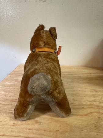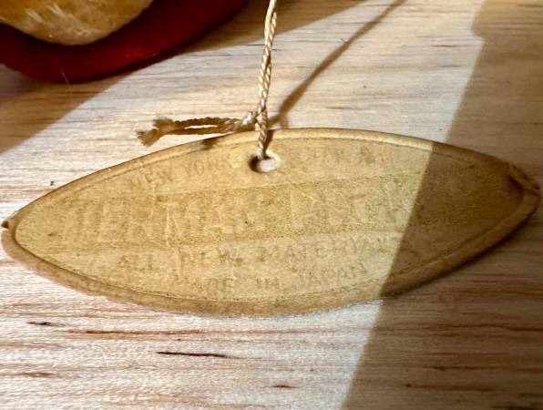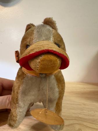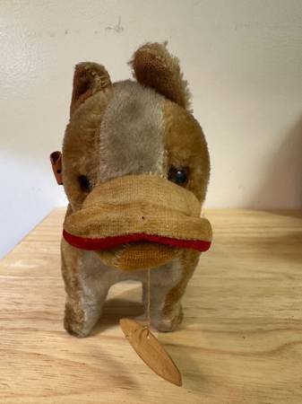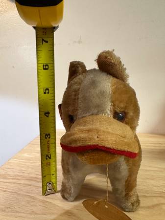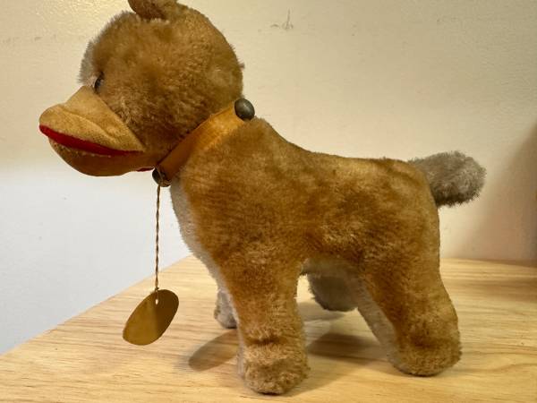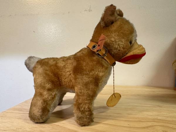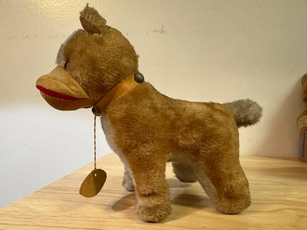 These is a vintage Herman Pecker miniature stuffed animal. Is it a dog? Is it a horse? You've got me. Ha. Herman Pecker Plushies are very collectible. Check out your favorite auction site for examples. I found some selling for $60. Manufactured in Japan. What kind of fabric is it? Mohair, you ask? I don't know. Tag only says it's all new material. Amazing workmanship. Strange upper lip flap. If it is indeeed a dog, one can only imagine the poor hound that was the model for this dog. Ha.