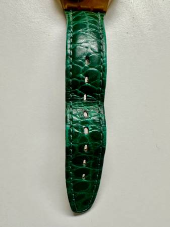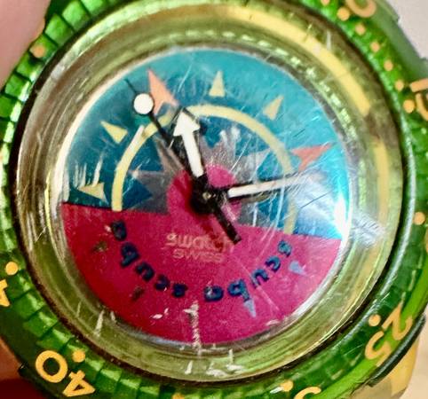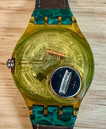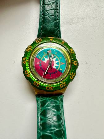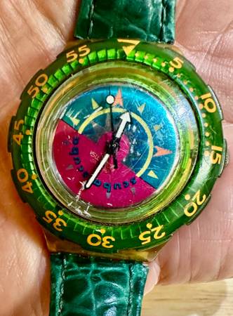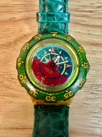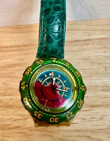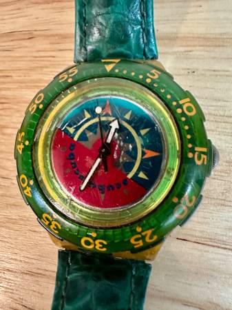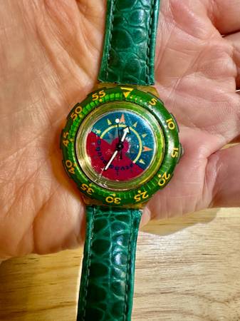 Calling all Swatch collectors! This is a way cool retro "Scuba" Swatch watch. Very cool "reptile skin" design leather watchband. Of course being Swatch it is Swiss made. According to the back of the watch it is water resistant to 200 meters = 650 ft. Watchband is in good condition, although a little bit stiff. Watch crystal (glass) is a little bit scratched. Needs a new battery, after which I assume it will work. I believe it was manufactured in the 1990s.
