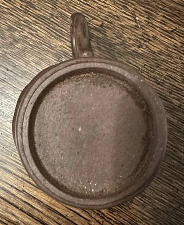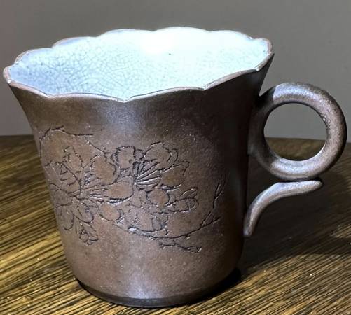 Unglazed Antique Ceramic Chinese Tea Cup. Engraved with a flower and Chinese symbols. 2" tall. Just lovely.