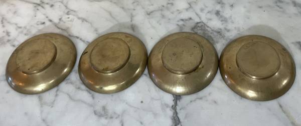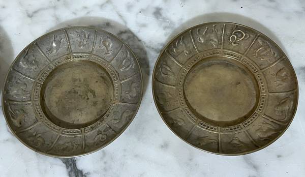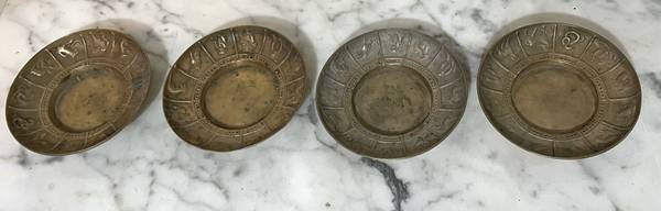 GROUP OF FOUR (4) VINTAGE CHINESE BRASS PLATES WITH ZODIAC FIGURES Size of each: 4" 2/8 diagonal $30 for the set Condition: Surface wear and dirt due to their age, no splits nor breaks Available for...