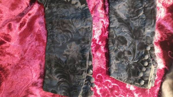 Together with black cut velvet by hand, Ostrich Feathers/ Cabbage roses from a 19th century bussel ladie's gown, with (2) inact button sleeves, that have "puffy" shoulders with taffeta