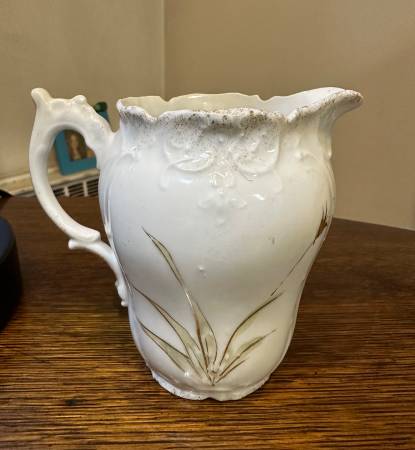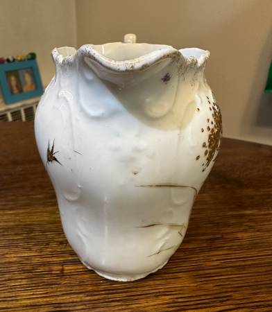 This is a lovely little antique creamer. Lovely flower design. A fragile, delicate beauty. No markings on the base. Provenance unknown. But hey, isn't it lovely!