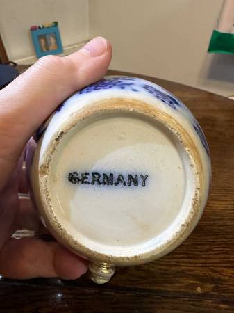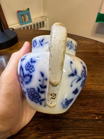 A lovely little creamer. Unfortunately, the gold paint on the spout has worn off over the decades. The handle is also a little worn for wear. But it is nevertheless a lovely design.