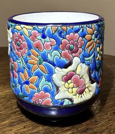 Just gorgeous! But is it a vase? A drinking cup? Or what? I just don't know. Only 3.75" tall, 3.5." Longwy is from France, and is very collectible.