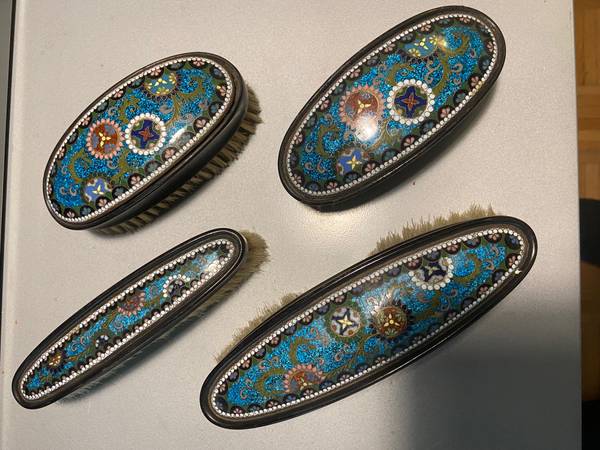 * Four gorgeous mother-of-pearl brushes, in different sizes and each with a different type of brush hair. The exterior of each brush gleams in ornamental turquoise, pink, red, white and olive colors.