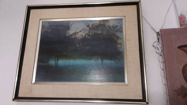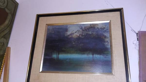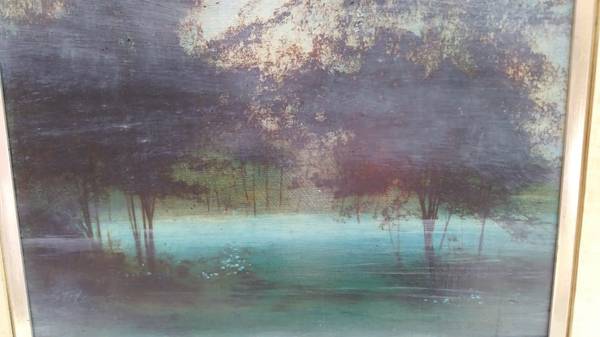 Trees on a lake, artist signed, vintage in gilt frame taken outdoors, no flash and with a flash 185