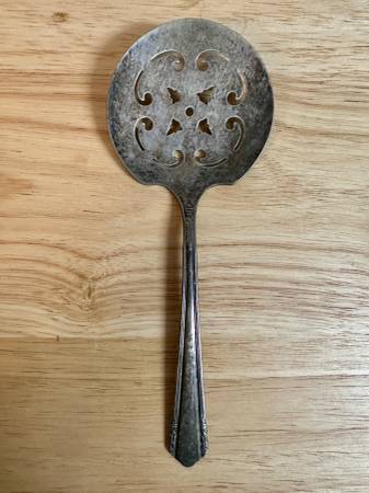 An elegant antique serving spoon from my mom's eclectic collection of rare serving utensils. Beautiful elaborate design. I believe this Wm Rogers "pierced" serving spoon is silverplate. A well used piece of silverware reflecting its years of service to some long since deceased family's dinners. Personally, I love the way the metal has tarnished with time. Impress your Thanksgiving guests as you serve their meal with this wonderful dinner tool of yesteryear. Get rid of your boring modern utilitarian utensils and replace them with this fascinating example of a bygone era.