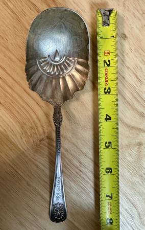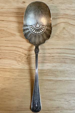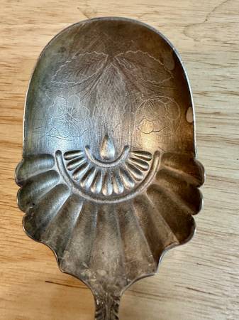 An elegant antique serving spoon from my mom's eclectic collection of rare serving utensils. Beautiful unique wash bowl floral design. Note the wonderful flower engraved inside the bowl of the spoon. Handle engraved to the "SS Class of 1889." Was this a memento of some long gone British boarding school class? I only wish I knew. A well used piece of silverware reflecting its years of service to some long since deceased family's dinners. Selling for more than double this price on Etsy.