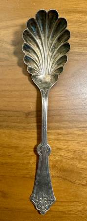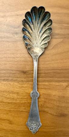 An elegant antique serving spoon from my mom's eclectic collection of rare serving utensils. Beautiful elaborate scalloped bowl design. My research indicates this S.H.M. & Co. serving spoon is silverplate. A well used piece of silverware reflecting its years of service to some long since deceased family's dinners.