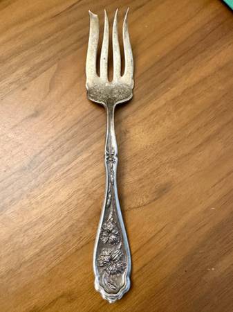 An elegant antique meat serving fork from my mom's eclectic collection of rare serving utensils. Beautiful ornate handle flows into a wonderful 4-pronged serving fork. Unique and collectible. This well used WR Keystone silverplate fork dates from the early 1900's. No doubt it was once considered the fancy silverware by some long since deceased family, to be used only on special occasions. Check out the wonderful carnation design embossed into the handle and under the prongs. How can you not be charmed?