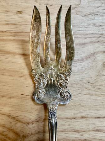 An elegant antique serving fork from my mom's eclectic collection of rare serving utensils. Beautiful ornate handle flows into a wonderful 4-pronged serving fork. Unique and collectible. This well used WM Rogers & Son silverplate fork dates from the early 1900's. No doubt it was once considered the fancy silverware by some long since deceased family, to be used only on special occasions. Check out the wonderful flower design embossed into the metal under the devilishly shaped prongs. How can you not be charmed?