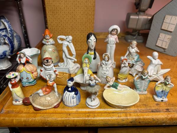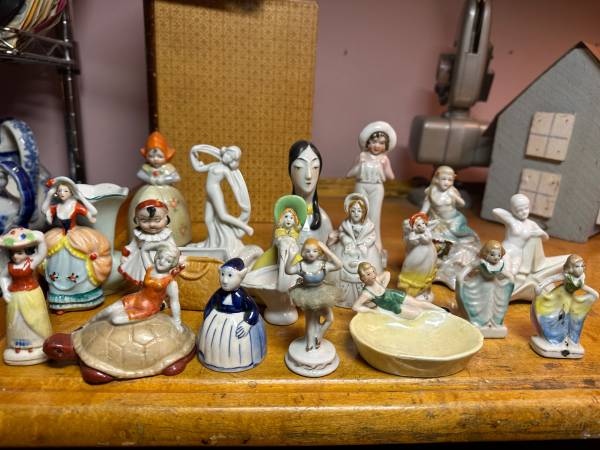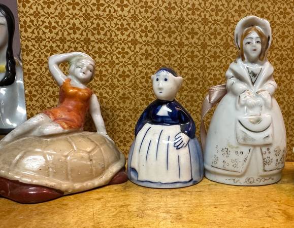 These highly collectible vintage hand painted porcelain figurines are just beautiful. Amazingly detailed, wonderfully decorated, and in great condition. And check out the poses! Most of these are stamped from Japan (not occupied Japan), which I'm guessing makes them 1950's-60's era. A couple of them are bells. They range from 2" to 5" tall. Come get them while they last. $10 apiece.