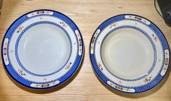 This is a pair of Beautiful Vintage Booths Silicon China soup bowls. Or salad bowls. Simple gorgeous design. No noticeable chips or fractures. The whites on one bowl exhibit a bit of browning, otherwise excellent condition. Nice intricate pattern around the rim. Just a really cool design! Very collectible. Think how delighted your dinner guests will be when their meal is served in such wondrous examples of artisanship from a bygone era.