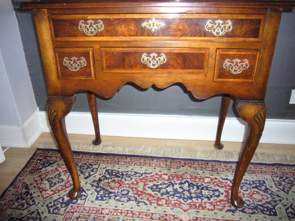 It features a rich, warm wood tone with ornate brass handles on its drawers. The table has gracefully curved cabriole legs, each adorned with intricate carved details resembling a shell or leaf motif near the top.