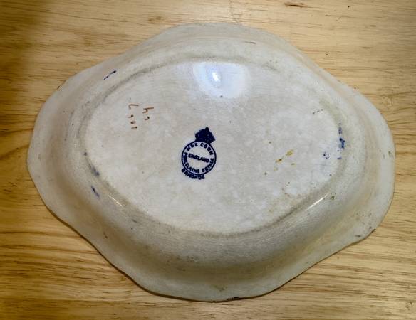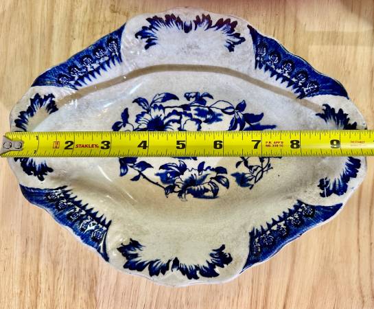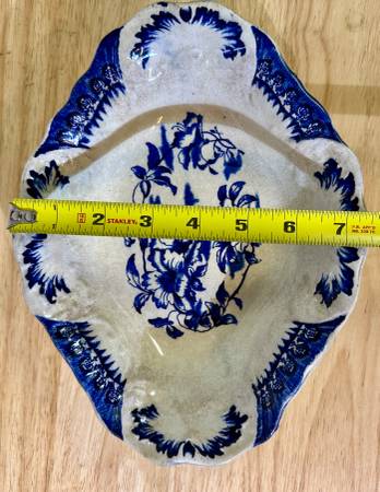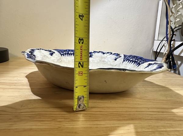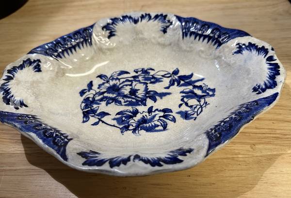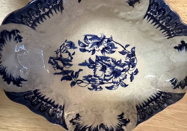 This is a rare antique W&E Corn Porcelaine Royale Bowl from England early 1900s, according to an auction website. This rare find has a really interesting shape and a lovely design. This bowl has what is called an "ormande pattern" which according to Chat GPT is a type of flow blue floral pattern. The interior of the bowl has nice scalloping that the camera cannot pick up. The white is showing some age discoloring, but otherwise this piece is in good condition. A rare find that would look great on your Thanksgiving table!