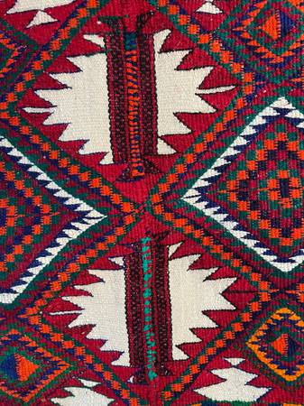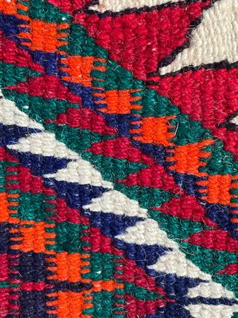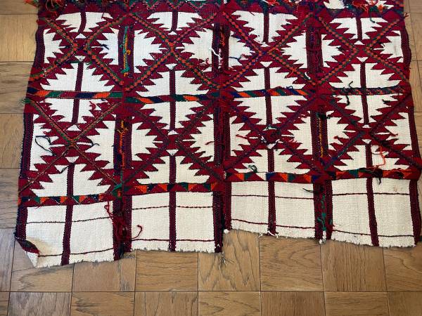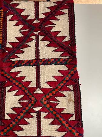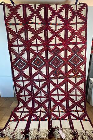 From my aunt's estate sale, this a large rustic handwoven Egyptian tapestry, approximately 112" x 64". One edge is fringed (see photo 9) and the other unfinished edge (see photo 10), there are a few small stains (see photos 5-6, 7-8), but overall the colors are vibrant and it is clean, pet/smoke free home. I've posted a pic (see photo 4) of the handmade label (ink on a scrap of fabric, it is mentioning "4 piece... something" possibly referring to the 4 panels woven together running the length of the tapestry).