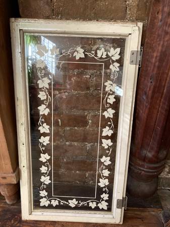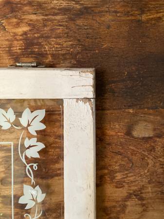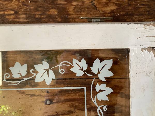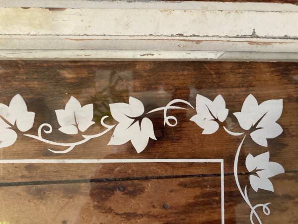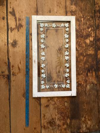 A vintage stenciled glass cabinet door with hinges. Some nicks (see pictures). Frame needs painting. Can be hung horizontally by the hinges; use as a table top or remove the glass from the frame and be imaginative. Images show front and back. Yard stick shown for scale.
