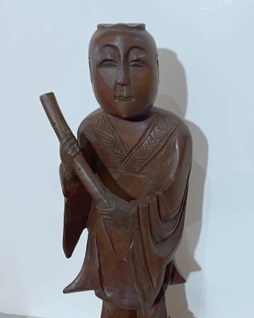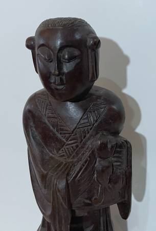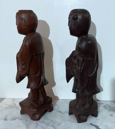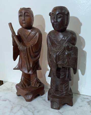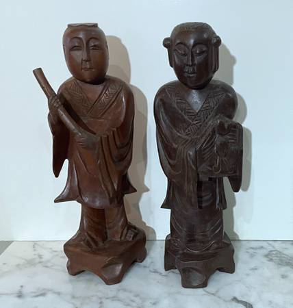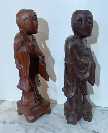 TWO BEAUTIFUL VINTAGE CHINESE CARVED WOOD STATUES OF MALE ANCESTORS FIGURES Size of tallest: 12" tall 4" 2/8 wide 4" deep Condition: In excellent vintage condition Available for pickup only 78th...