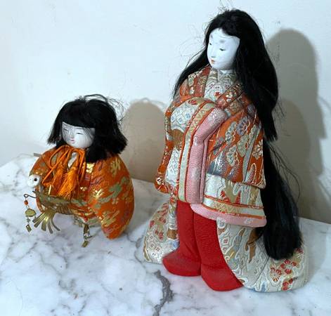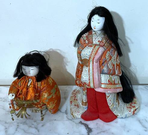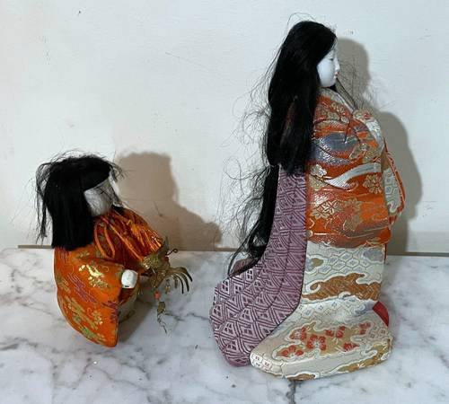 TWO BEAUTIFUL VINTAGE JAPANESE GEISHA DOLLS DRESSED IN BROCADE...
