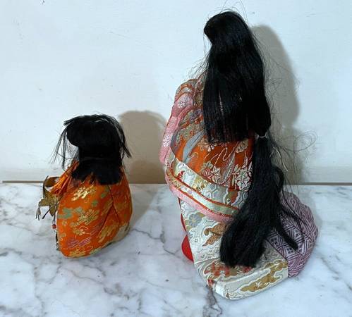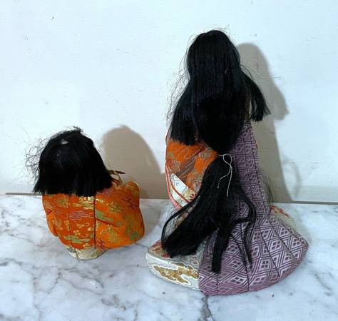 GROUP OF TWO BEAUTIFUL VINTAGE JAPANESE GEISHA DOLLS DRESSED IN BROCADE FABRIC The largest: 10" 5/8 tall 7" wide 6" 1/2 deep The smallest: 6" tall (without the metal head piece) 5" wide 3" deep...