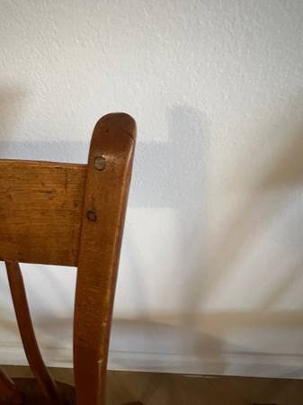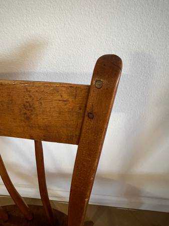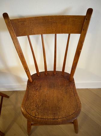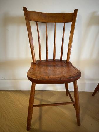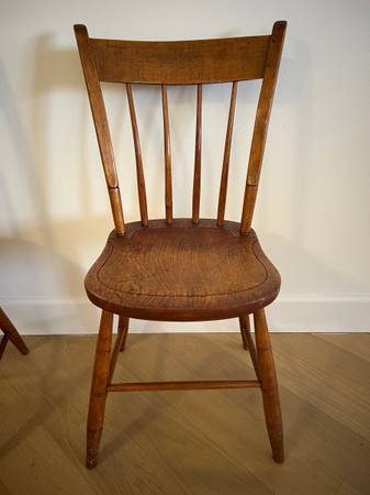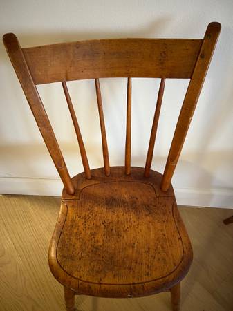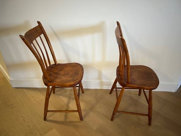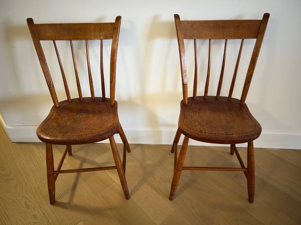 We are selling these two beautiful matching, Shaker spindle farmhouse side chairs. I believe the chairs are made of maple and they measures 33 inches high from the top of the back to the floor, 17 inches from the seat to the floor, 14 1/2 inches across the seat and 16 inches across the back. The chairs are sturdy and are in excellent antique condition.