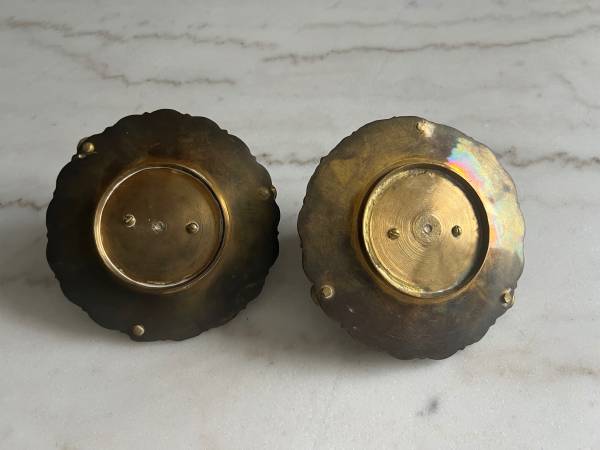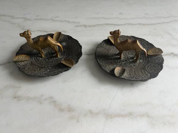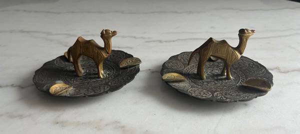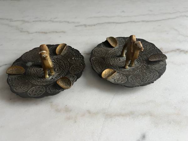 You are viewing two (2) stunning, matching, brass, Middle Eastern, camel ashtrays with intricate design elements. Each ashtray measures 5 1/4 inches across . These ashtrays are in very good condition and just need a good cleaning to bring them back to their “like new” glory!!!. Don’t let these fabulous pieces pass you by!