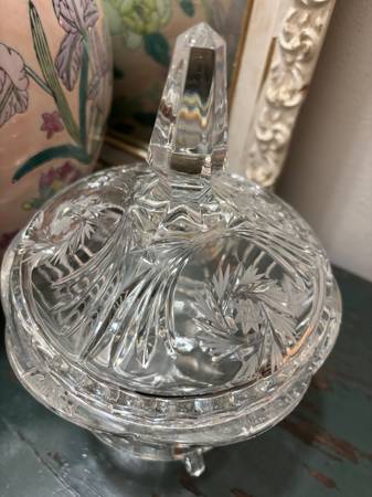 This gorgeous vintage lead cut crystal candy/dish with an etched design will add sparkle to your table in any home decor. 8 3/8 inches H 5 7/8 inches W High-quality crystal Mint condition $30 Cash...