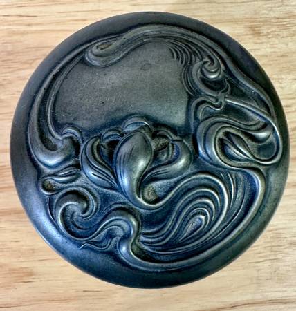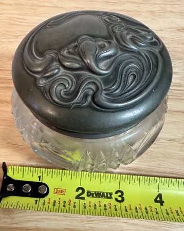 This is a beautiful old powder jar with an Art Nouveau lily pattern on its Repoussé Silverplate lid. Patented 1904. Would not be out of place on a Victorian era Vanity Table. There is a star pattern on the bottom and a serrated vertical line pattern around the side. This jar measures approximately 3” tall and 4” across. The glass is heavy and 1/4” thick. It is in good vintage condition. There is a patent date on the inside of the lid, June 1904. Similar type jars sell for much more on well known auction sites.