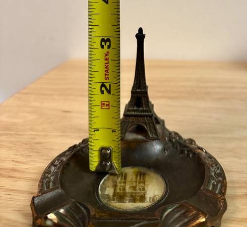 This is a vintage Eifel Tower ashtray. Wonderful kitschy design. Nice condition. That's Notre Dame in the center of the tray. This is not just for smokers or tourists. It's a unique conversation starter that will enliven any evening soiree. It might even encourage you to take up smoking. Just imagine yourself flicking your ashes into its ultra cool tray à la Jean Paul Belmondo or Jean Seberg. How can you resist?