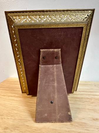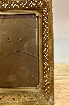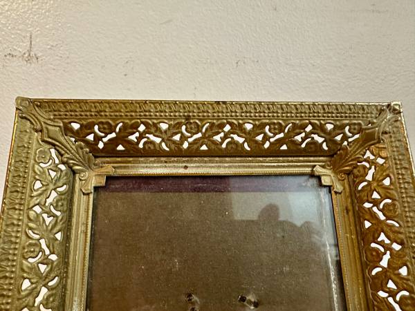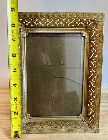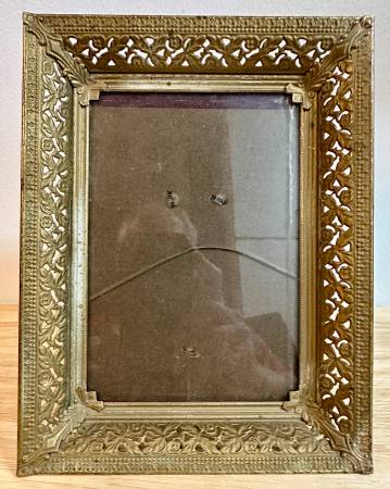 Lovely Ornate Brass (?) Filagree Picture frame. Elegant intricate design. Would look just great with your family photo gracing its wonderfully retro look. The glass does have a big crack through its middle, but you can just remove the glass. A glossy photo with no glass would look just as great.