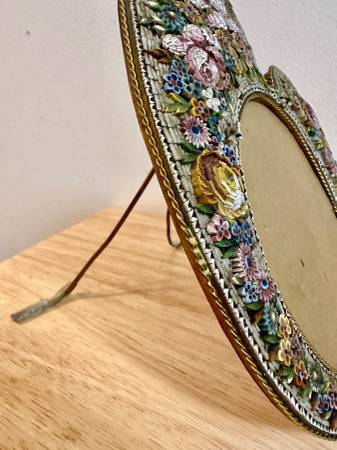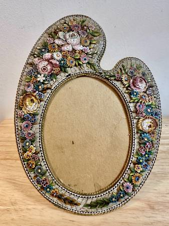 Beautiful vintage Italian Micro Mosaic Picture Frame. As far as I can ascertain, this is from Florence. Uniquely shaped frame. Gorgeous floral design. Incredibly intricate mosaic. I believe the mosaics are tiny pieces of glass. The oval center no longer has its glass protector. The original photo backing is also lost to history. It looks like mom cut out a piece of cardboard to serve as backing. The frame itself appears to have a brass backing.