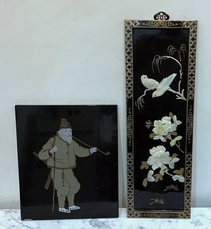 TWO (2) BEAUTIFUL VINTAGE JAPANESE PANELS - ONE IS MOTHER OF PEARL INLAID WITH BIRDS & FLOWERS, THE OTHER IS A LACQUERED PANEL DEPICTING A MALE FIGURE