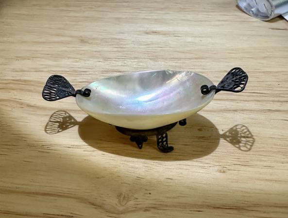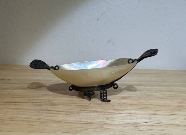 A wonderful Vintage Mother of Pearl Caviar Dish. Beautiful finely detailed metalwork. What a lovely tiny piece. Although two of its 4 legs have broken off, it is still able to balance on its remaining two legs. The shell also has a slight chip. Despite these faults, this is a rare find. Perhaps those among you who love arts and crafts can even repair it.