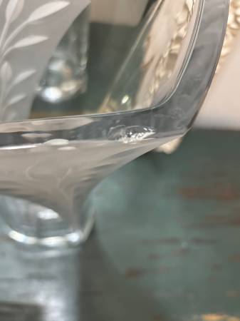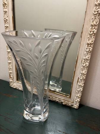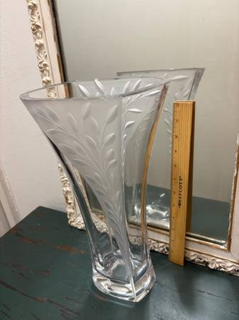 This gorgeous vintage crystal vase with frosted leaf design would make a stunning statement piece in any home decor. 14 inches H 4 inches W Weighs almost 7 lbs Excellent condition (teeny chip as...
