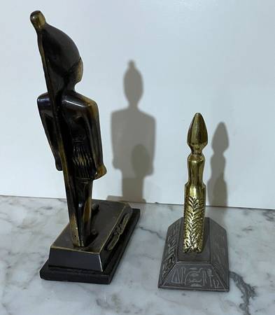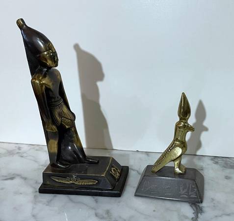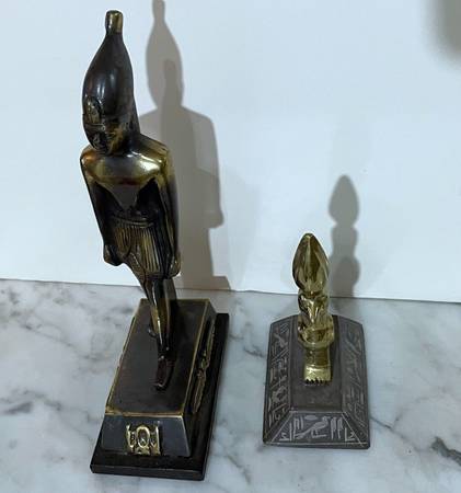 TWO (2) BEAUTIFUL VINTAGE SOLID METAL EGYPTIAN STATUES OF A PHARAOH AND GOD HORUS Pharaoh: 8" 2/8 tall 2" 2/8 wide (base) 4" 1/8 deep (base) Horus: 5" 1/8 tall 2" 1/8 wide (base) 3" 1/8 deep (base)...