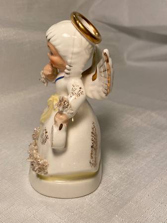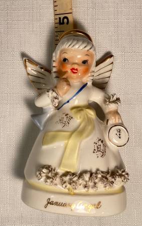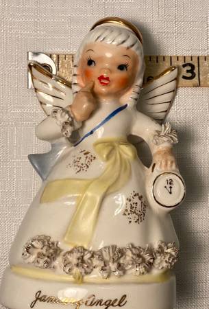 This vintage NAPCO Lefton January Angel figurine is a charming collectible piece from the mid-20th century. Hand-painted in a multicolor glossy finish, this small porcelain and ceramic figurine features a girl as the subject, making it a perfect addition to any bedroom or collector's display. The 1950s style and originality of this figurine showcase the craftsmanship of the era, making it a unique and nostalgic piece for any occasion. She has a hairline crack in her hairline. As seen in photos.