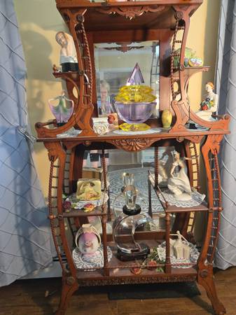 UP FOR SALE IS A BEAUTIFUL ANTIQUE WOOD DISPLAY UNIT. MEASUREMENTS ARE IN THE PICTURES. MY FAMILY CAME OVER FROM EUROPE IN THE EARLY 1900'S AND SETTLED IN HOBOKEN. THIS IS WHERE IT ORIGINATED WITH MY FAMILY. IT IS ABOUT 100 YEARS OLD (I THINK). IT IS RICKETY AND WOBBLY, BUT THE WOOD IS NOT ROTTED AND CAN HOLD MANY PIECES. FRONT AND BACK AND BOTTOM STILL STURDY. WILL FIT IN A SUV WITH THE BACK SEATS DOWN. NO DELIVERY. I LIVE NEAR THE HUDSON RIVER, CLOSE TO THE BRIDGE. ASK ANY QUESTIONS, KATHY show contact info