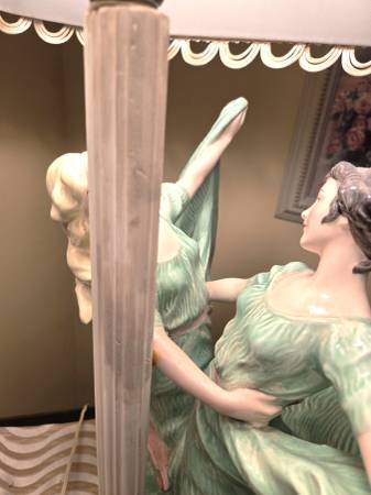 HELLO, UP FOR SALE IS A BEAUTIFUL OLD PODANY [SIGNED[ LAMP. TWO GIRLS DANCING WITH GREEN DRESSES ON. BOTH DRESS ARE GREEN. SHE MEASURES 32 INCHES WITHOUT THE SHADE. BOTH GIRLS ARE IN GREAT CONDITION WITH GREAT COLOR ON THEIR FACES AND DRESSES. I BROGHT THIS LAMP TO ANTIQUES ROAD SHOW ABOUT 15 YEARS AGO AND THEY APPRAISED IT FOR $800. ON THE POLE IT IS DISCOLORED IN THE BACK [PICTURED] I SAID IT WAS ONCE REPAIRED AND THE APPRAISER DISAGREED WITH ME. I STILL THINK I AM RIGHT. YOU CANNOT SEE IT FROM THE FRONT. 32 INCHES HIGH. ALL HALLMARKS ON THE BOTTON. PLEASE LOOK AT ALL THE PICTURES AND CALL ME WITH ANY QUESTIONS. LAMP SHADE IS AN OLD MESS. WHEN YOU PCK UP I WILL DEFINATELY INCLUDE THE SHADE AND YOU CAN DO WHAT YOU WANT WITH IT. LOOK AT THE POLE IN THE BACK CAREFULLY, IT LOOKS REPAIRED TO ME. SHE LIGHTS AND DISPLAYS BEAUTIFULLY. THIS IS A CASH ONLY DEAL. I LIVE BETWEEN THE GW BRIDGE AND THE LINCOLN TUNNEL CLOSE TO THE HUDSON RIVER. 10 MINUTES FOR THE CITY, WE HAVE THIS LAMP AT LEAST 60 YEARS BUT IS OLDER THAN THAT. I HAVE ONE PHOTO THAT I TOOK AT THE ANTIQUES ROADSHOW BUT MISPLACED IT. I DEFINATELY WILL SEND IT TO YOU WHEN I FIND IT. I WILL FIND IT. PLEASE ASK ANY QUESTIONS, show contact info