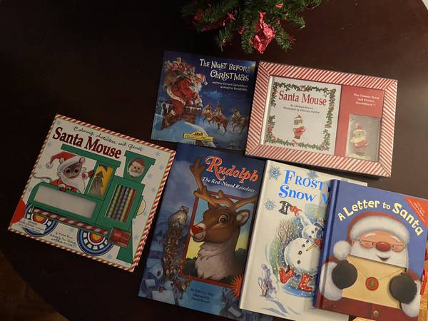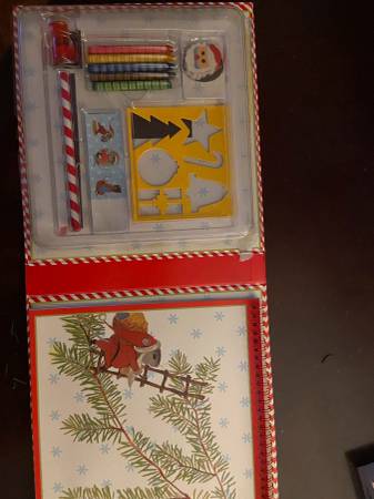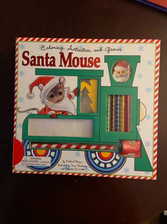 See attached pictures of items. One comes with a Santa Mouse snow square, another with Christmas stationary for writing letters to Santa, and a third with Christmas coloring pages with stickers, stamps. Crayons and a Santa eraser.