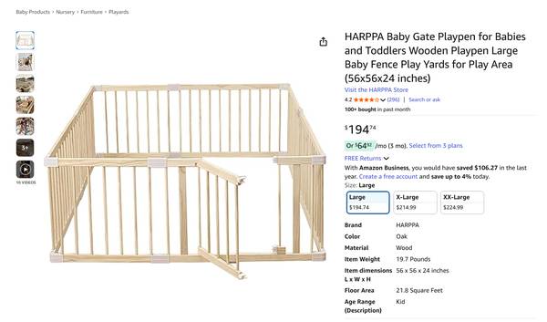 See Amazon listing for specifications and more details: https://www.amazon.com/HARPPA-Playpen-Fence-Babies-Toddlers/dp/B0BHN4C6CD/ref=sr_1_1_sspa?dib=eyJ2IjoiMSJ9.qwFOWdCM1ZceDGPHCDZ70fFisDgfFI_6OPn9Cs0e7gInqdqV7Zs31tKQMqcch63S371PekqWqaSMvgj_Z9zDDZBhM0AZVlfmZAYqPQTS0XjTwAsIFAFd2q3pQZr6eUUAY1D1spKLCNxvGVi7ce7qmF9U-VruVvLl2Uj7Xpj1ho8A1ICZUSMj0o-MAx4e_zwTKojNb8Ziyn2Uw922miHZGK75GgrXeYDUDYvgJicpMa7JDsDCDpW3zEZ5yro94MaysdOrJICM537Njibojn1BmohASIUejAkVmWPYMG_iDWE.U-DAUiwfAjPJH7IFPXVkW4Dddtt6jUaixq4y7xSLmOo&dib_tag=se&hvadid=736971286781&hvdev=c&hvexpln=0&hvlocphy=9004078&hvnetw=g&hvocijid=15212053239402252172--&hvqmt=e&hvrand=15212053239402252172&hvtargid=kwd-2366055146873&hydadcr=22631_13766780&keywords=harppa%2Bbaby%2Bplayard&mcid=cc3070413fa236f5baae4314b68294aa&qid=1759866709&sr=8-1-spons&sp_csd=d2lkZ2V0TmFtZT1zcF9hdGY&th=1
