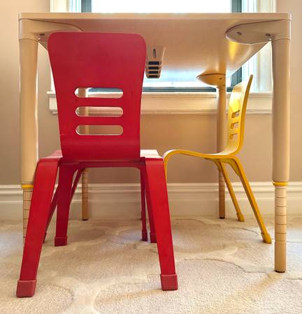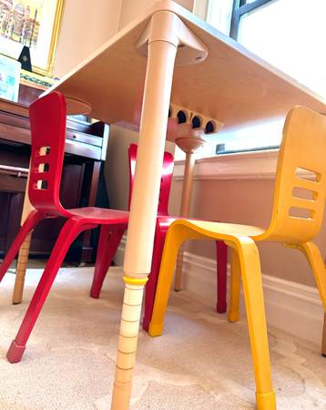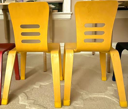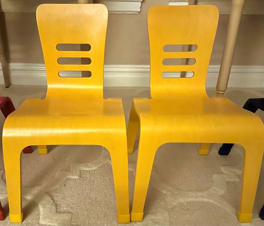 Beautiful children’s chairs Bent wood, rubber non-slip feet Colors: 2 blue, 2 yellow, 2 red $29 ea. 6 total available Ideal for children 4-8 yrs. *2 matching adjustable square natural wood color...