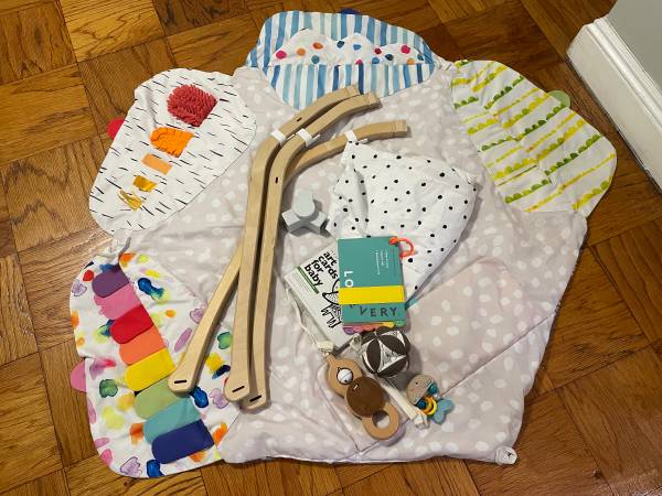 Lovevery play gym in good condition. No stains or rips and fully functional, but there are signs of use. Bundle includes all parts shown and an additional Haba rattle and some Wee Gallery black and white cards, which can be used with the play gym.