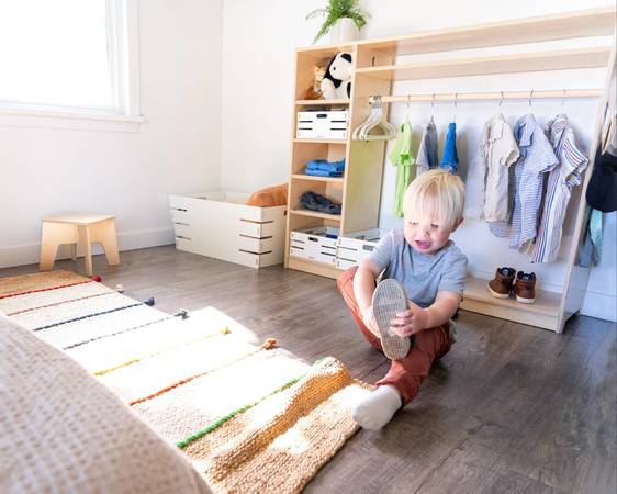A Montessori wardrobe encourages independence by giving young children easy access to their clothing. With a simple, open design, this low wardrobe is accessible to support decision-making, self-care, and personal expression, all of which are key elements of a Montessori environment.