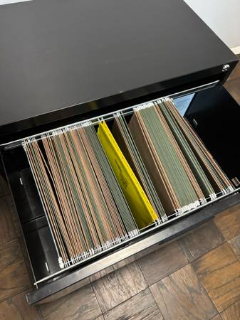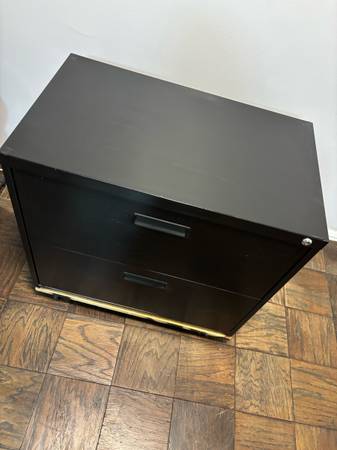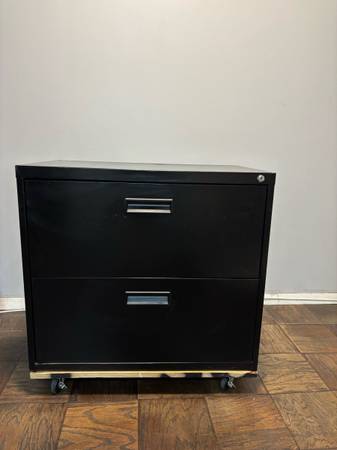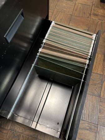 Sturdy black metal filing cabinet on wheels.