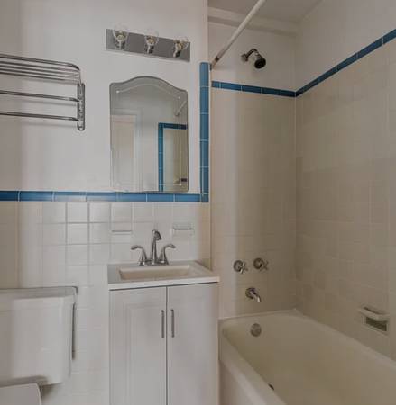 Large north-facing windows fill the space with natural light, creating an open and airy atmosphere. The windowed kitchen provides full-size appliances and efficient cabinetry, while the classic tiled bathroom retains elegant prewar detailing.